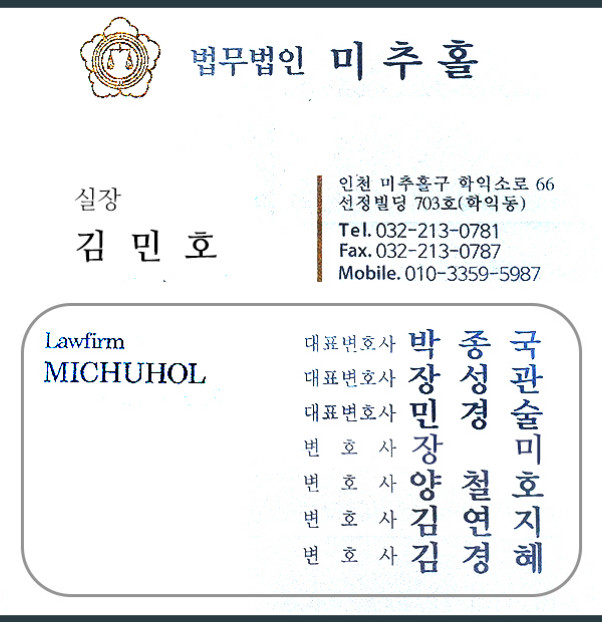주소: 대한민국 인천광역시 미추홀구 학익동 학익소로 66 선정빌딩 법무법인 미추홀 703호.